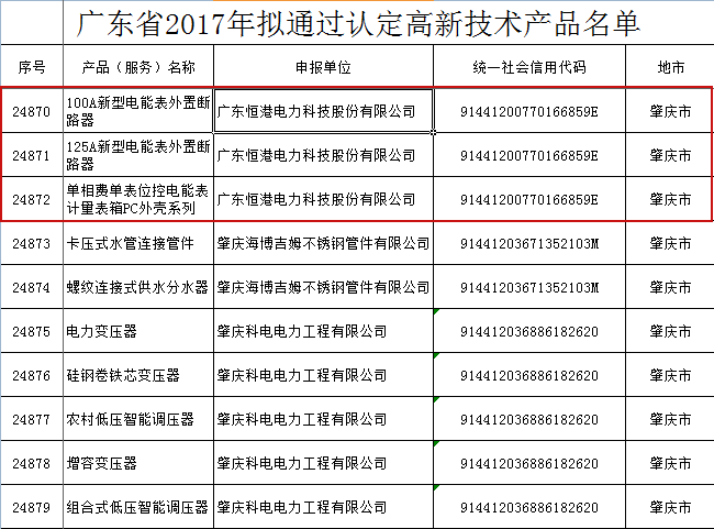 關于公示廣東省2017年擬通過認定高新技術產品