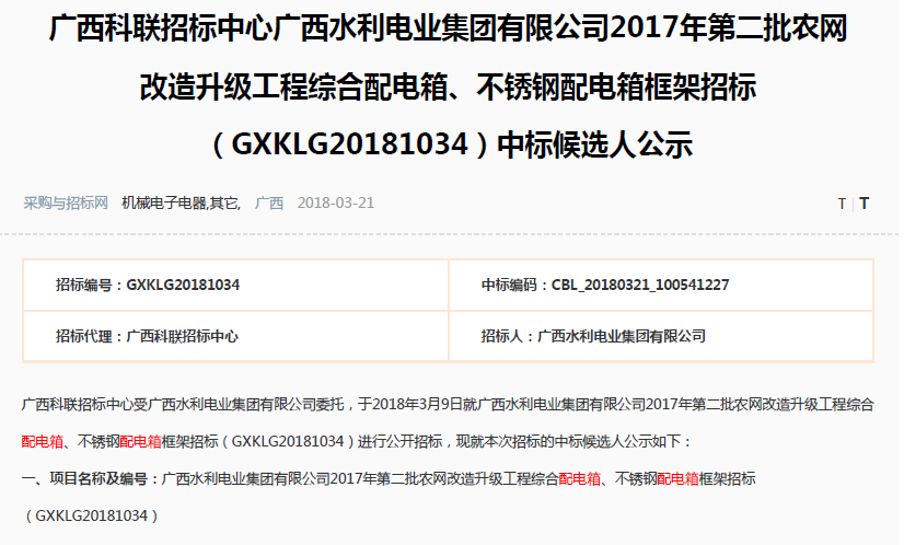 廣西水利電業集團有限公司2017年第二批農網改造升級工程綜合配電箱、不銹鋼配電箱框架招標(GXKLG20181034)中標候選人公示