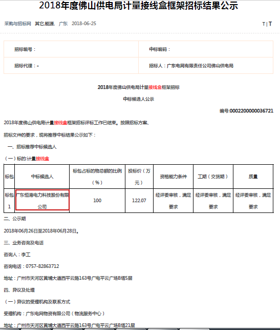 2018年度佛山供電局計量接線盒框架招標結果公示