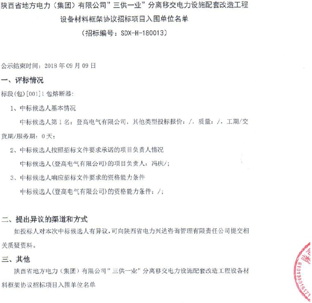 熱烈祝賀我司中標陜西省地方電力(集團)有限公司”三供一業”分離移交電力設施配套改造工程設備材料框架協議招標項目