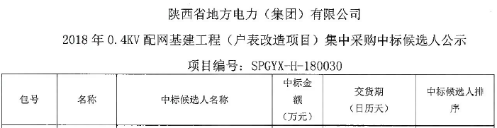 熱烈祝賀我司在陜西省地方電力(集團)有限公司2018年0.4KV配網基建工程(戶表改造項目)集中采購中標