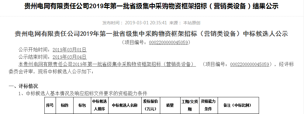 熱烈祝賀我司在貴州電網有限責任公司2019年第一批省級集中采購物資框架招標(營銷類設備)中標