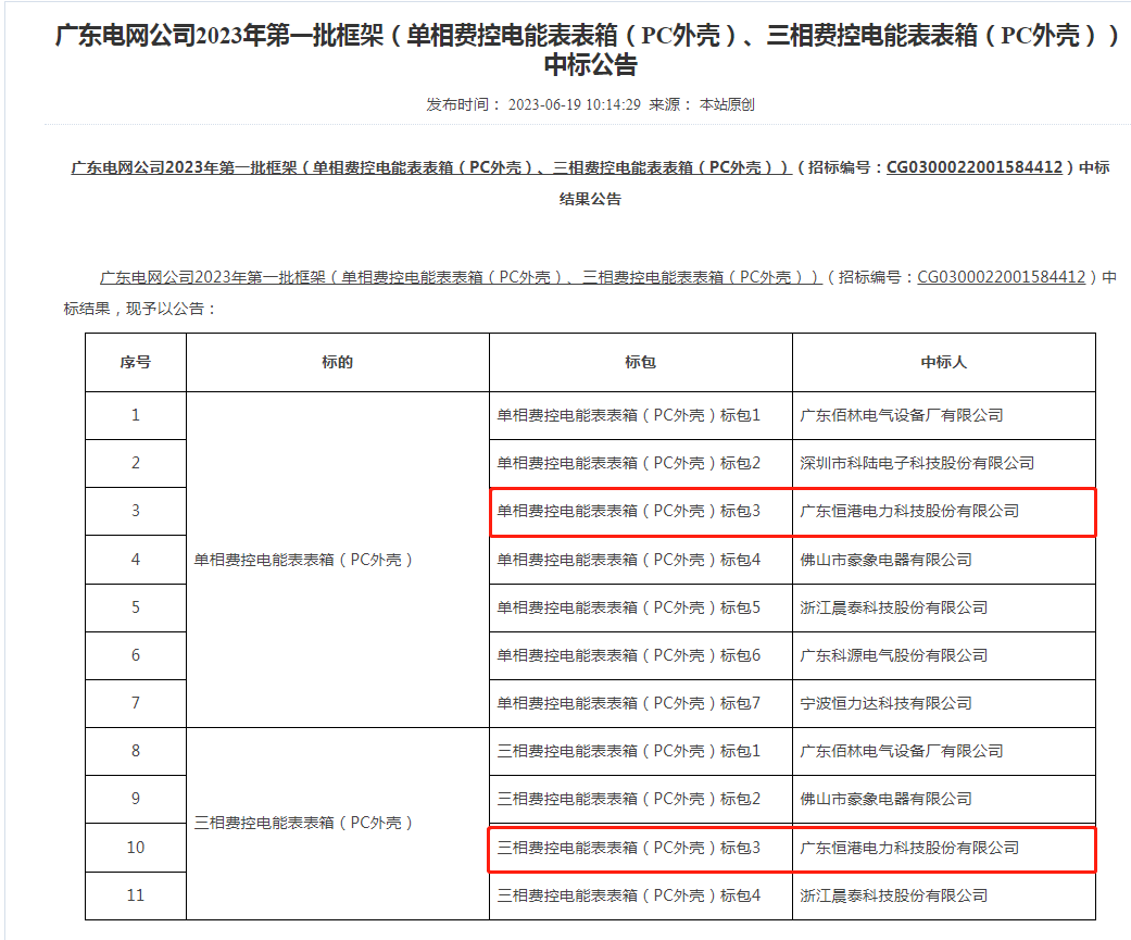 六月初夏,荷風送香、中標喜訊隨著花香如約而至。2023年 6月19日,南方電網供應鏈統一服務平臺中標結果公示。我司成功中標"廣東電網公司 2023 年第一批框架(單相費控電能表表箱(PC 外殼)、三相費控電能表表箱(PC 外殼))"項目 單相費控電能表表箱(PC 外殼)和三相費控電能表表箱(PC 外殼)兩個標段。項目點點滴都凝聚著恒港人執著奮進、團結協作的敬業精神。讓我們繼續攜手共進,再奪佳績!!!