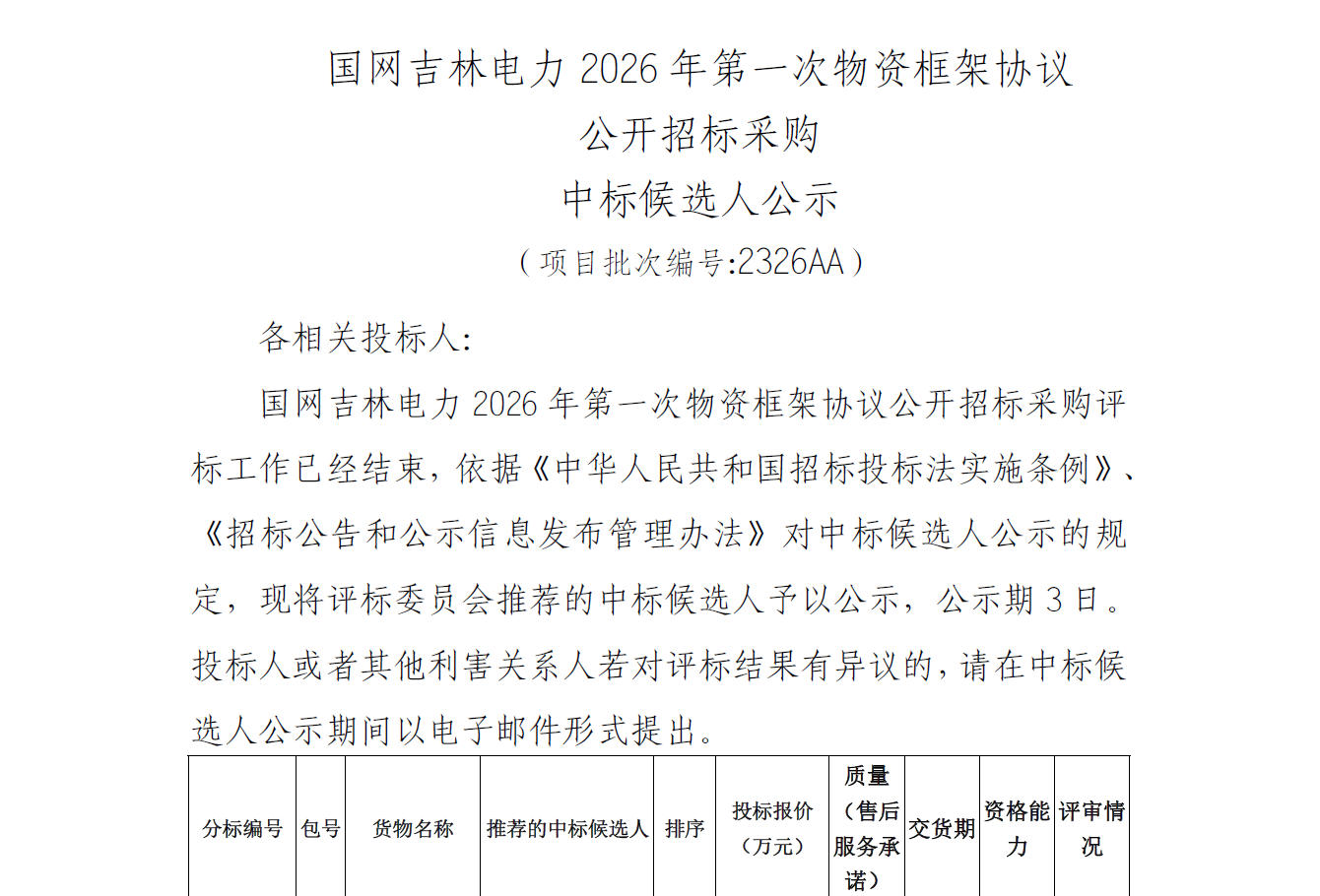 【中標(biāo)喜訊】熱烈祝賀我司中標(biāo)國(guó)網(wǎng)吉林電力2026年第一次物資框架協(xié)議公開(kāi)招標(biāo)采購(gòu)項(xiàng)目