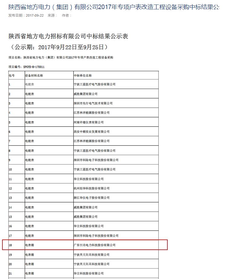 2017年專項戶表改造工程設備采購項目中標結果公示表